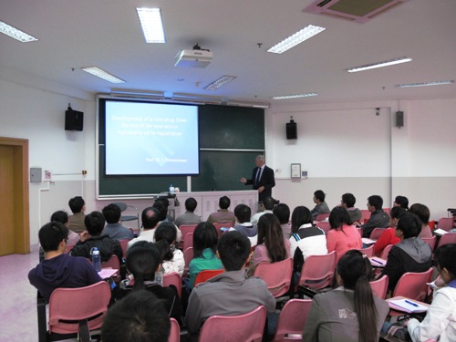 Zimmermann教授的首场报告从药物发现、临床前研究、临床研究和上市注册等几个环节详细介绍了新药从发现到上市的流程。详细剖析了各个环节可能存在的问题,并就如何减少药物研发成本、提高药物开发成功率提出了许多有借鉴意义的思路。第二场报告中,Zimmermann教授展示了不同规格的硅胶等材料对纳米微粒性能的影响,并展望了纳米材料在药物制剂方面的未来发展。报告结束后,Zimmermann教授与在座师生就药物研发的热点问题进行交流,教授言谈风趣,讲解耐心,会场气氛十分热烈。
