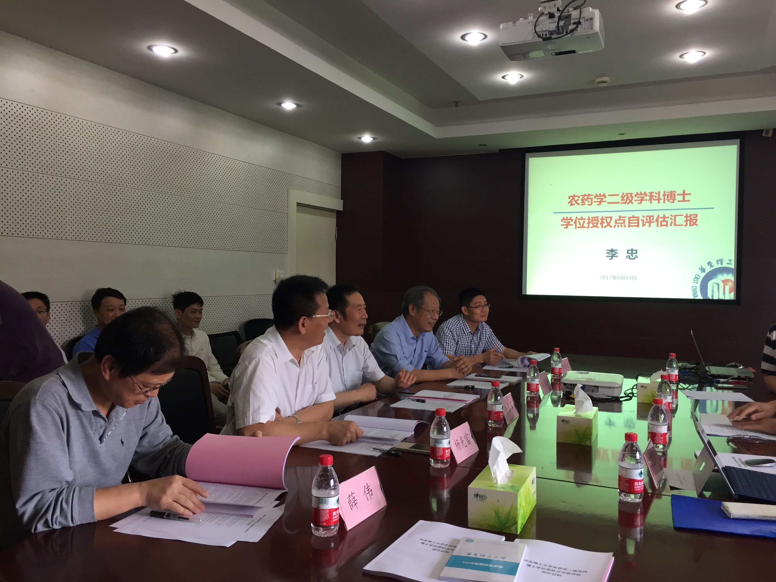 院长宋恭华主持。专家组由国务院学位委员会植物保护学科评议组成员、南京农业大学植物保护学院韩召军教授,浙江大学农业与生物技术学院、农药与环境毒理研究所朱国念教授,教育部科学技术委员会化学化工学部委员、国家自然科学基金委员会第十三届化学学科评审组成员、华中师范大学农药与化学生物学教育部重点实验室主任杨光富教授,贵州大学贵州省精细化工研究开发中心副主任薛伟教授,中国植物保护学会青年工作委员会副主任、中国昆虫学会毒理学专业委员会委员、江苏省昆虫学会理事、南京农业大学植物保护学院刘泽文教授组成。