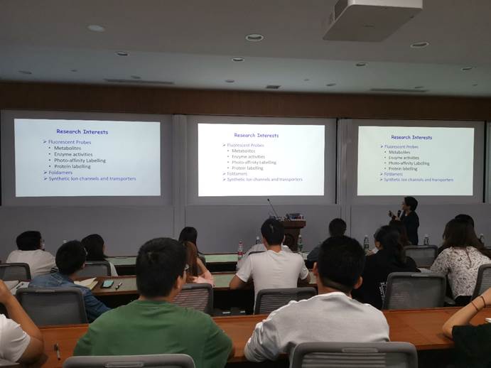 杨丹的研究涉及有机合成化学、生物有机化学、化学生物学等领域,目前的研究方向包括活性氧/氮荧光探针的开发及应用、自组装离子通道及转运蛋白的设计应用、利用天然产物及合成化合物探究炎症及癌症中的信号转导过程等。讲座中,她向在场师生系统性介绍了其活性氧/氮荧光探针及光交联标记蛋白质方面的工作。杨丹将其深厚的有机合成背景与化学生物学相结合,设计开发了一系列高选择性、高灵敏性的小分子荧光探针(HKSOX, HKPerox, HKOCl, HKOH, HKGreen/HKYellow)分别对超氧阴离子、羟自由基、次氯酸、羟自由基和过氧亚硝酸跟实现特异性检测。探针被广泛应用于共聚焦荧光成像、流式细胞仪分析、组织染色和斑马鱼成像中。这些强有力的小分子荧光工具随后被用于氧化还原生物学和药学机理的探究中,能够加速新型诊断及治疗方法的发现,为小分子荧光探针的发展做出了突出贡献。结合近期取得的丰硕成果,杨丹教授由浅入深的阐述了新型探针检测机理的思路与应用,她对化学及生物应用的深入思考让在场师生深受启发。