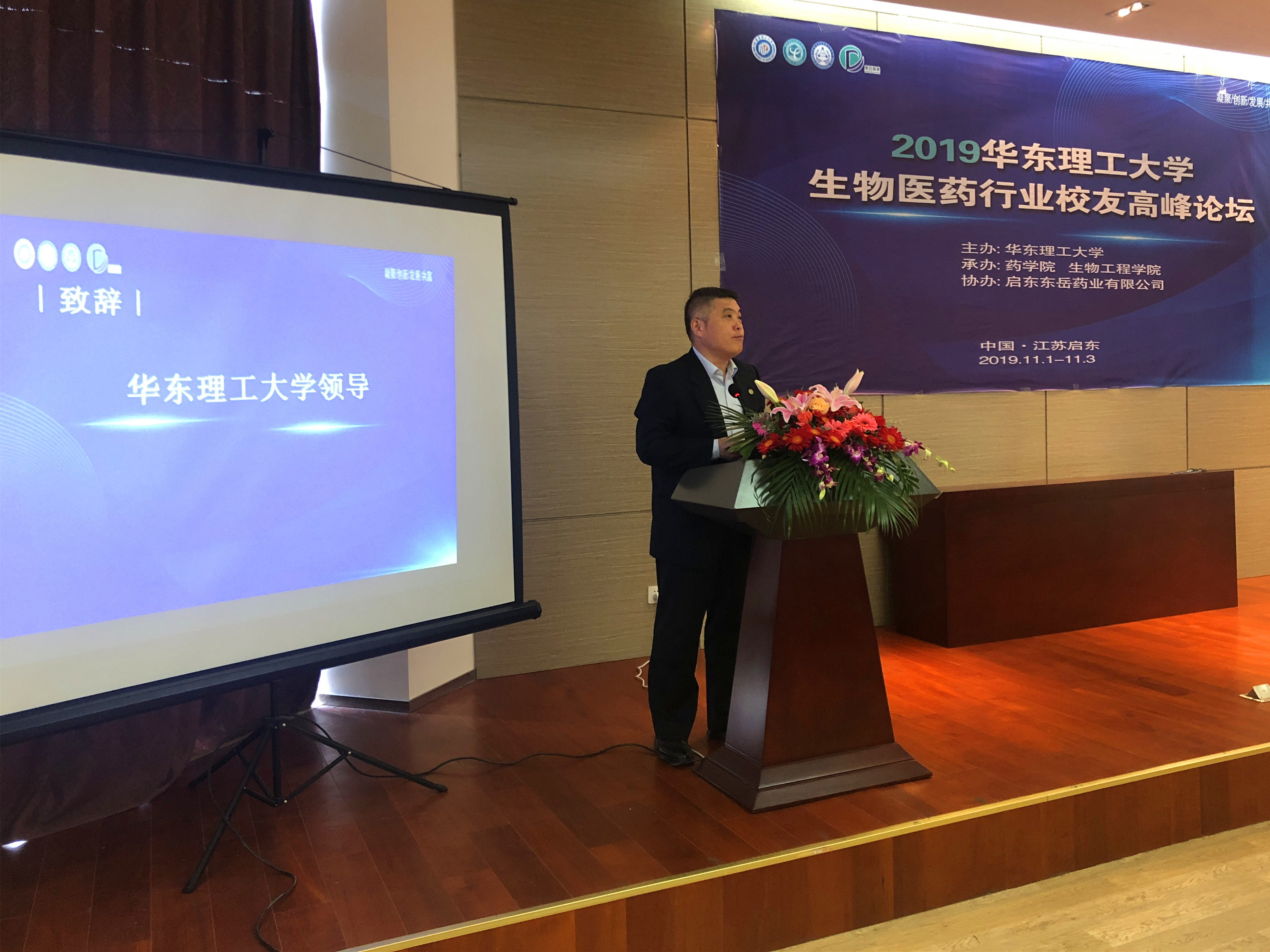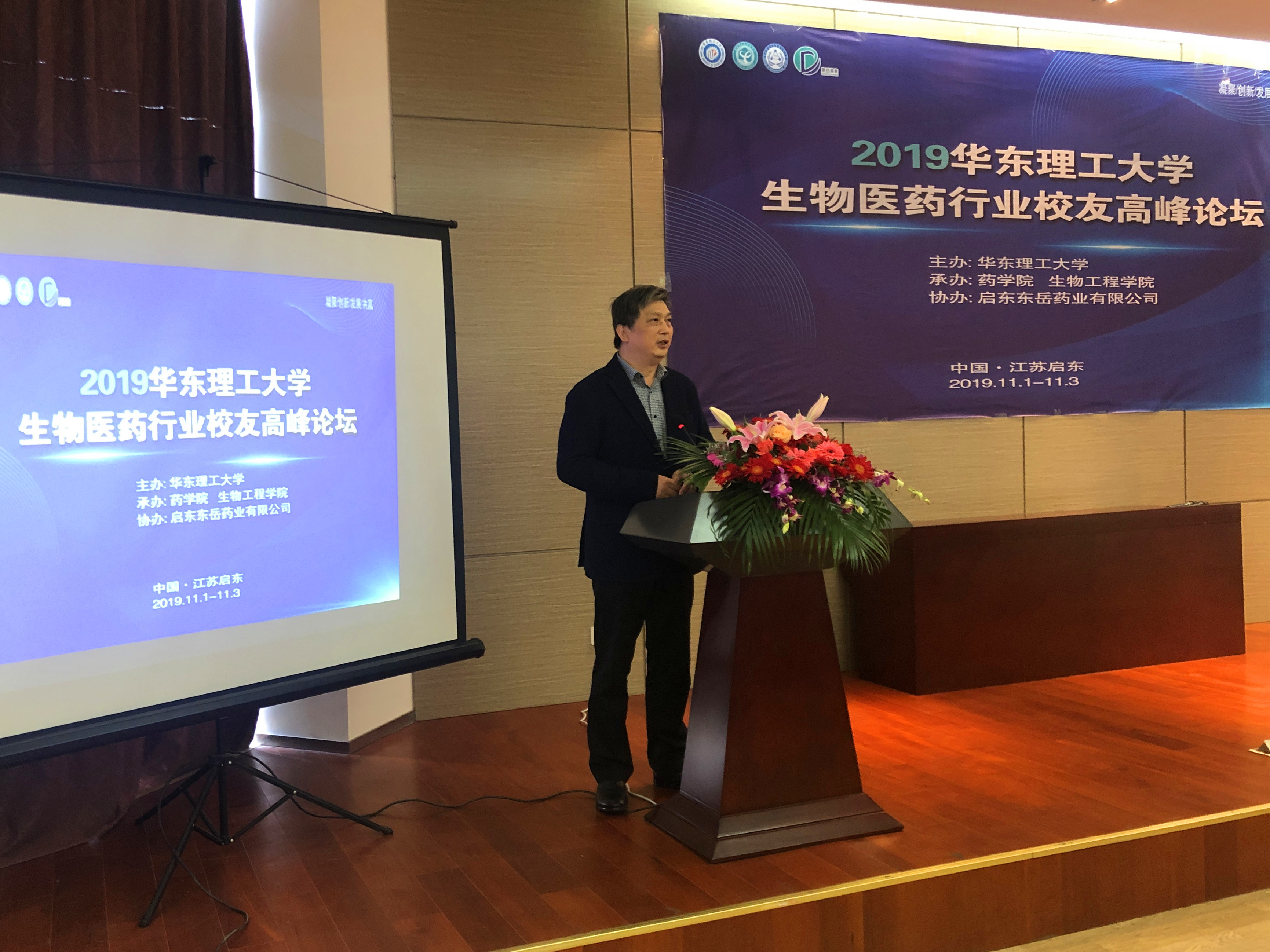 校友工作情况,并结合生物医药行业目前所面临的挑战与机遇,阐述了此次校友行业论坛开展的重要意义,希望以此次论坛为源头,以学校为中心,凝聚行业校友力量,共同推进我国生物医药行业及学校的长足发展,为政产学研用的合作搭建桥梁与纽带,也希望广大校友对学校发展多提宝贵意见,为学校“双一流”建设积极献计献策。