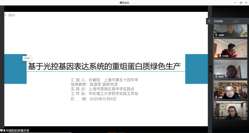 上海市药学实践工作站于近期完成了“第五期上海市青少年创新实践活动”的项目结题工作,由工作站负责人马磊主持,工作站的各位指导老师与管理老师参与,组织来自上海中学、位育中学、西南位育中学和复旦实验中学四个实践点的60名同学们在线完成了结题答辩。本次汇报分两轮进行,首先12月12日学生分为四组进行结题汇报,并推选出14位的学生参加12月19日的推优答辩,最终评选出6名优秀学员。
