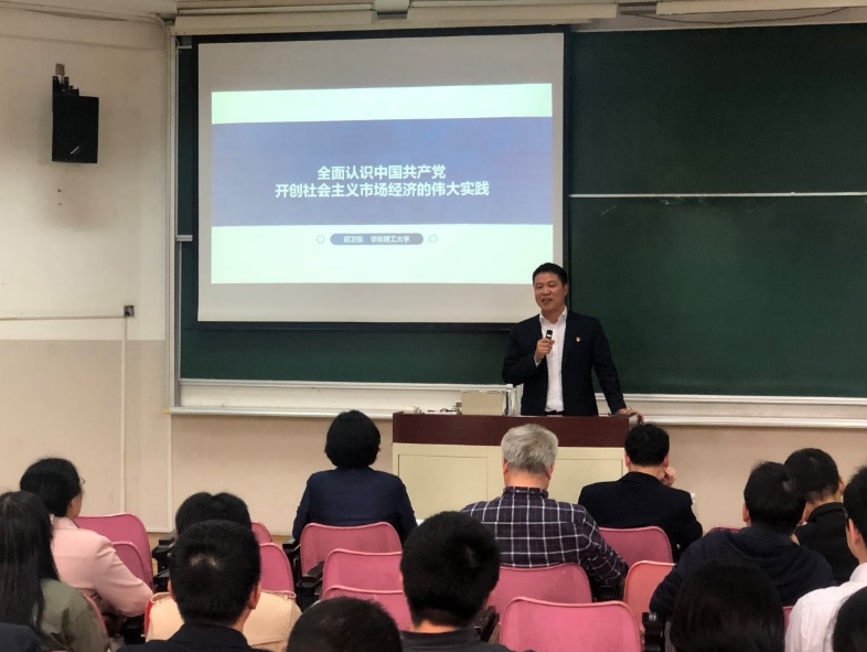 首先邱卫东以“全面认识中国共产党开创社会主义市场经济的伟大实践”为主题进行宣讲。他从开创中国特色社会主义市场经济的历史背景、历史本质、总体进程三个方面,对中国共产党开创社会主义市场经济的伟大实践进行了阐述,帮助大家深刻认识了中国共产党领导中国人民开创和发展社会主义市场经济所经历的艰辛过程以及所取得的伟大成就,坚定了大家对中国共产党带领中华人民走向中华民族伟大复兴的信心,也加深了大家对“我们党的历史,是一部不断推进马克思主义中国化的历史,就是一部不断推进理论创新、进行理论创造的历史”的理解。邱卫东的宣讲,脉络清晰、内涵丰富,受到与会教职工的一致好评。