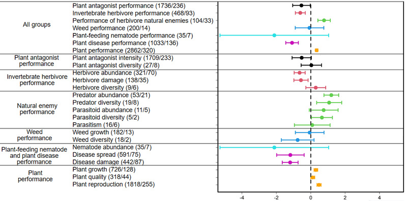 已有理论研究与实践探索表明,利用生物多样性防控植物有害生物,是安全可行的生态环保技术途径之一,实施该技术控害的理论支撑主要来自物种多样性控害,例如,天敌假说、资源集中假说、保险假说、聚集假说(Wan* et al., J. Appl. Ecol., 2022)营养级联动理论(Wan et al., Nature Plants, 2020)等。然而,基因多样性(或称“遗传多样性”)控害的理论相对较少。鉴于此,该文整合了全球413个植物多基因与单/纯基因的比较试验数据,结果显示:在农业、森林、草原、湿地、海洋等生态系统,增加植物基因多样性,提高了捕食性和寄生性天敌的丰度和捕食/寄生率,降低了植食性昆虫、杂草以及植物病害、线虫的侵害,提升了作物产量与品质以及植物生产力;并发现植物多基因与单/纯基因对增加农业、森林、草原等生态系统中的天敌及其增强控害效果并无显著影响。因此,在该类系统实施植物保护技术时,只需在主栽植物田块通过间套作同种其他1个品种,便可实现对植物病虫草的控制。