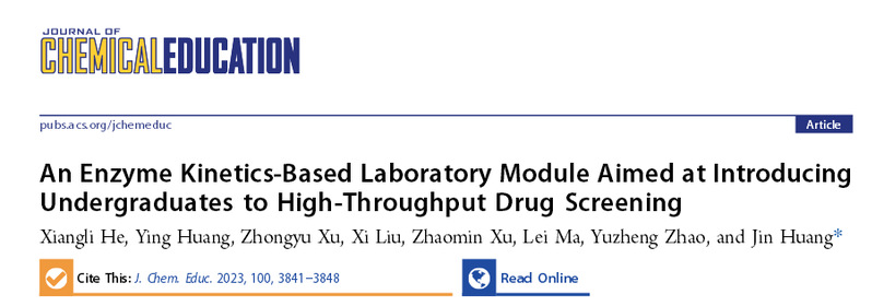黄瑾教授团队结合本科教学特点,对现代药物研发早期阶段常用实验技术——高通量药物筛选技术进行优化设计,成功将其引入药学本科教学的课堂教学及实验教学中,让学生在较短时间内,熟悉、理解并掌握相关实验技术,取得了良好成效。相关成果被选为内封面论文发表于美国化学会旗下国际著名教育期刊Journal of Chemical Education上。