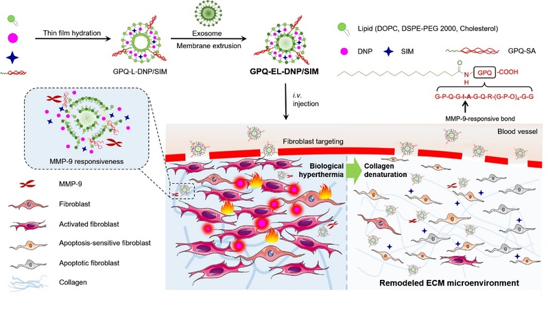 高峰教授和陈彦佐副教授研究团队报道了一种用于负载线粒体解偶联剂2,4-二硝基苯酚(DNP),并经由GPQGIAGQR(GPO)4GG (GPQ)修饰的成纤维细胞来源的外泌体/脂质杂合纳米递药系统(GPQ-EL-DNP),结合生物热疗重塑细胞外基质(ECM)微环境,进而提高促凋亡药物辛伐他汀(SIM)的抗肺纤维化疗效。