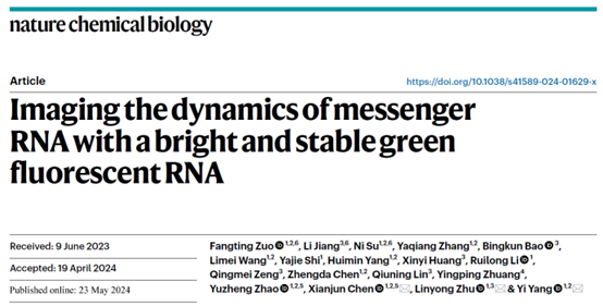 近日,成人影片 成人影片 、生物反应器工程国家重点实验室、光遗传学与合成生物学交叉学科研究中心杨弋、朱麟勇、陈显军教授组成的研究团队在活细胞RNA成像技术研究中取得突破性进展,在国际著名学术期刊《自然—化学生物学》(Nature Chemical Biology)以长篇论文(article)形式在线发表题为“Imaging the dynamics of messenger RNA with a bright and stable green fluorescent RNA”的研究论文。