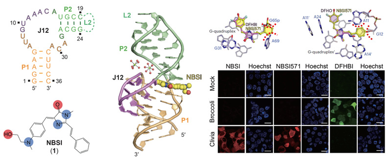 RNA具有独特的三维结构和种类繁多的生物学功能,广泛参与细胞的各类生命活动,与多种疾病的发生与发展密切相关。荧光RNA是近些年来发展起来的活细胞RNA成像技术。与荧光蛋白一样,研究人员只需要将荧光RNA的编码序列与靶标RNA编码序列融合,在细胞内表达后,即可对活细胞RNA进行标记成像。2023年杨弋、朱麟勇、陈显军以及任艾明课题组联合攻关,创新发展了Clivia系列大斯托克斯位移荧光RNA,具有高稳定性、高信噪比、高亮度,是目前唯一可用于活细胞分析的大斯托克斯位移荧光RNA,也是唯一可在活体上对RNA动态进行测量的荧光RNA(Nature Methods, 2023, 20, 1563)。然而,Clivia和荧光染料NBSI的识别和发色机制仍不清晰,这个谜底的揭示不仅对于Clivia荧光RNA的进一步优化和应用拓展具有重要意义,还可以为更多具有特殊性能荧光RNA的创造提供新的思路。