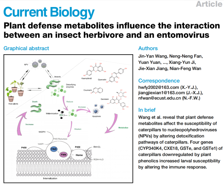 近日,成人影片 万年峰研究员课题组,联合我国、英国、美国科研人员,阐明了植物多样性介导下植物次生代谢物通过调节昆虫解毒代谢影响病毒杀虫剂杀虫效果的机制,在国际生物学著名期刊Cell子刊—Current Biology上以Articles形式发表了题为“Plant defense metabolites influence the interaction between an insect herbivore and an entomovirus”长篇研究论文。