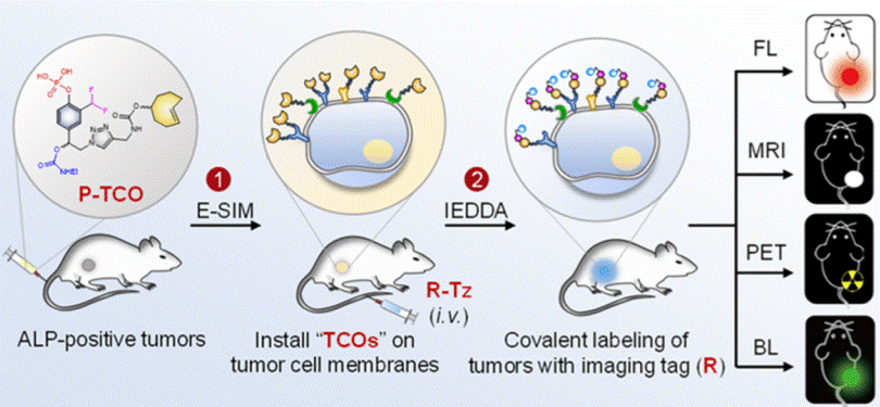 此外,谢贺新教授课题组与南京大学叶德举教授团队、江苏省原子医学研究所林建国研究员团队合作,在预靶向多模态活体动物肿瘤成像取得最新进展,相关成果以“Pretargeted Multimodal Tumor Imaging by Enzymatic Self-Immobilization Labeling and Bioorthogonal Reaction”为题发表在Journal of the American Chemical Society。该研究以研究团队前期发展的碱性磷酸酶自锚定探针(Chem. Eur. J. 2019, 25, 13994)为预靶向基团,通过亚甲基苯醌中间体的形成将反式环辛烯(TCO)选择性共价标记在活体动物肿瘤细胞膜上,进而通过快速的生物正交反应,将含有四嗪的各种信号报告基团(如荧光染料、磁纳米粒子、放射性核素、生物发光蛋白等)选择性富集在肿瘤细胞中,从而实现对活体小鼠肿瘤的高灵敏荧光、核磁共振、正电子发射断层及生物发光等多模态成像。南京大学博士研究生缪银杏、副研究员王宇琦、成人影片