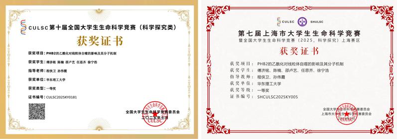 本科生团队凭借凭借扎实的科研积累、严谨的探究思路与从容自信的现场表现,获得评审专家的高度认可。经过激烈角逐,参赛项目《PHB2的乙酰化对线粒体自的影响及其分子机制》最终斩获国家级一等奖,上海市一等奖。项目由程侠卫教授、孙伟霞博士指导,由傅济铭、陈楠、邵卢艺、任思齐、徐宁浩共同完成。