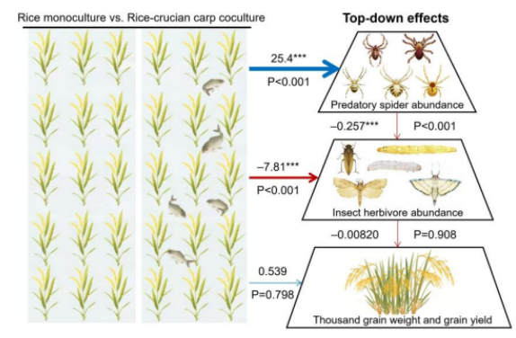 全球数据分析表明,与水稻单作相比,稻鱼共生使水稻产量平均提升12.5%,水稻增产因鱼的种类不同而不同(图2);与单一种植水稻相比,稻鱼共生可使产量提高12.5%,同时使无脊椎天敌(捕食者/寄生者)数量增加99.3%,并有效抑制害虫(减少24.1%)、病害(减少38.8%)和杂草(减少45.7%)(图2);就不同气候带、水稻类型和试验类型而言,温带控害与增产效果比热带的效果好,非有机稻田控害与增产效果比有机稻田的效果好,小区试验控害与增产效果比盆栽试验的效果好(图3);下行效应路径分析结果显示,在水稻-病虫草害二营养级互作系统中,稻鱼共生通过抑制有害生物来增产,在水稻-害虫-天敌三营养级互作系统中,稻鱼共生通过增加天敌数量来抑制害虫,进而实现间接增产效应(图4),将全球数据分成不同气候带、水稻类型和试验类型后,这种下行控制作用在有机与非有机系统、温带与热带地区均持续存在,即,稻鱼共生→促进天敌种群→抑制害虫→促进水稻生产力。