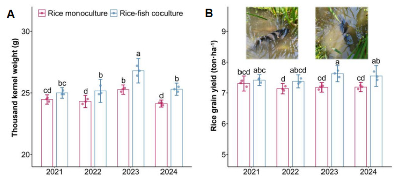 图6 四年野外试验证实:稻鱼共生模式增加水稻千粒重和产量
