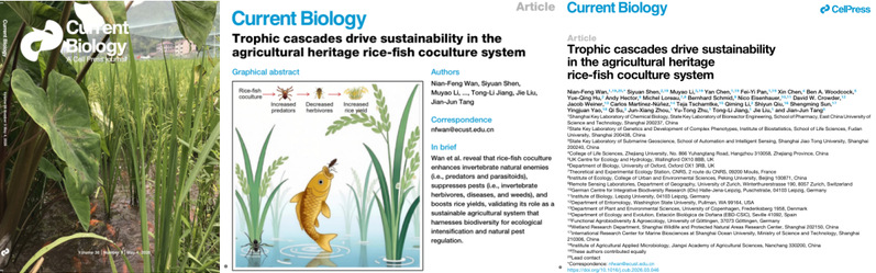 万年峰教授课题组,联合中、英、法、美、德、瑞士、丹麦、西班牙等国家的科研人员,在国际生物学著名期刊Cell子刊—Current Biology上以封面文章形式发表了题为“Trophic cascades drive sustainabilityin the agricultural heritagerice-fish coculture system”研究性论文。该研究为具有数千年历史的稻鱼共生模式(全球重要农业文化遗产)提供了坚实的科学依据。研究整合了全球18个国家的实验数据,并在中国东部开展了长期田间定位与行为学实验,系统证实了这一古老农艺不仅能增产,更能通过生态调控机制控制病虫害,为生态农业转型与保障粮食安全开辟了科学路径。